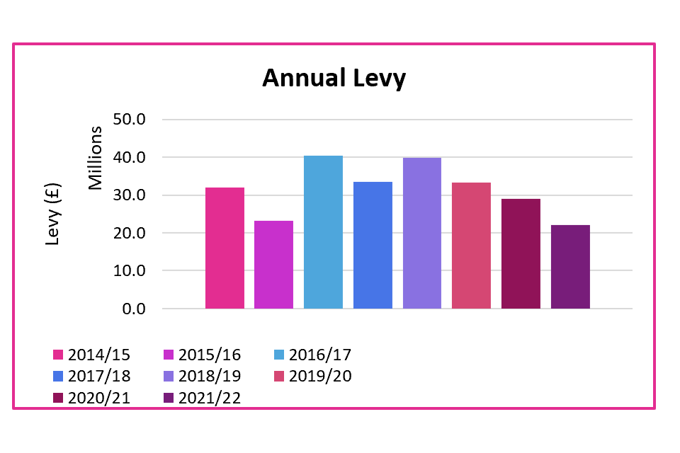 The Scheme is funded by a levy on the insurance industry. To meet the full costs of the Scheme, regulations require active employers’ liability insurers to pay an annual levy based on their relative market share. This levy encompasses the capital payments made to applicants, administration costs, and costs associated with collecting the levy. The levy in 2021 to 22 was set at £22 million. The chart shows the annual amount levied since the scheme began in 2014.