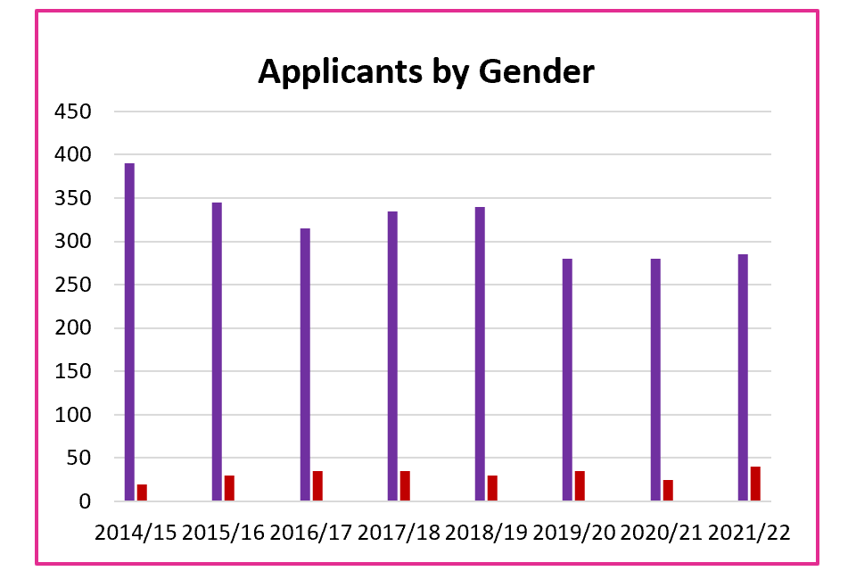 In 2021 to 2022, the percentage of female applicants increased to 12%. This was up from the previous highest percentage of 11% in 2019 to 2020.