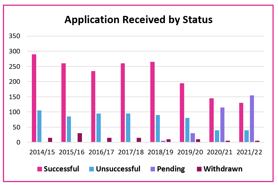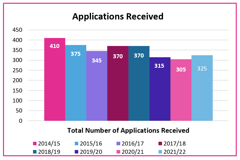 In the year 1 April 2021 to 31 March 2022, 325 applications have been received. This is approximately 7% more than in 2020 to 2021. The number of applications received since 2014 is shown opposite.