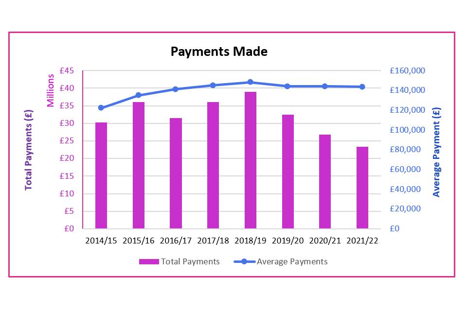 The average (mean) payment made to successful applicants in the 12 months to March 2022 was £144,000 and was the same as the average (mean) payment in the 12 months to March 2021.