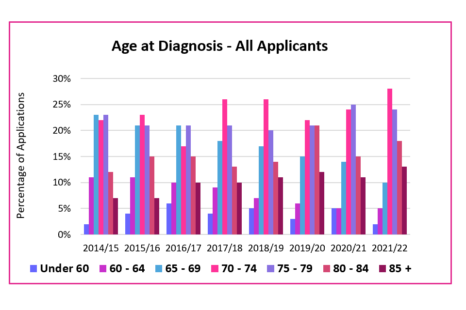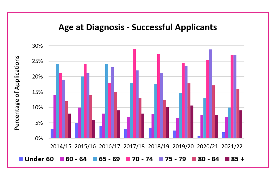 There are no age restrictions on applicants, but the potential award amount depends on the age of the applicant at the date they were diagnosed. The 12 months to 31 March 2022 saw a slight increase in applications received from those in the 80-84 age range from 15% in 2020/21 to 18% in 2021 to 2022.