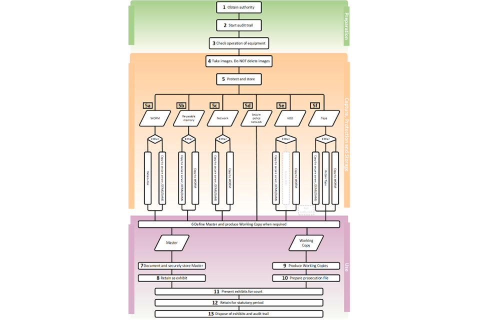 It is focused around a flowchart that guides the reader through the process from the initial preparation and capture of images, through the transfer and designation of Master and Working Copies, to the presentation in court and finally the retention and disposal of exhibits.