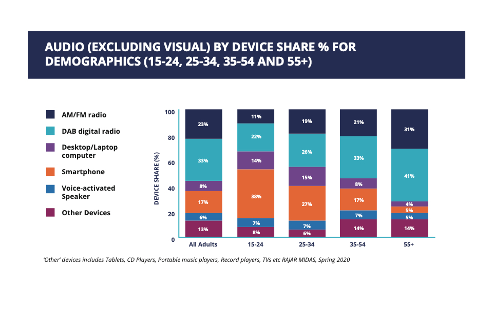 2.1 Radio and audio listening habits are evolving, influenced by the development of new services and the growing adoption of digital devices: not just DAB radios, but also smartphones and smart speakers, which have given access to a huge array of online audio. Nevertheless, the radio habit remains strong, with 9 in 10 adults in the UK tuning in for an average of 20 hours a week[footnote 12]. As of Spring 2020, live radio accounted for 72% of all UK audio listening, with on-demand music streaming accounting for 14%, followed by podcast listening at 4% and other forms of audio including listen again, audiobooks, online tracks, vinyl and CDs accounting for the remaining 10%. Online listening has grown in particular among younger audiences with on-demand music streaming accounting for 44% of 15-24s listening time and podcast listening accounting for a further 5%.[footnote 13]
