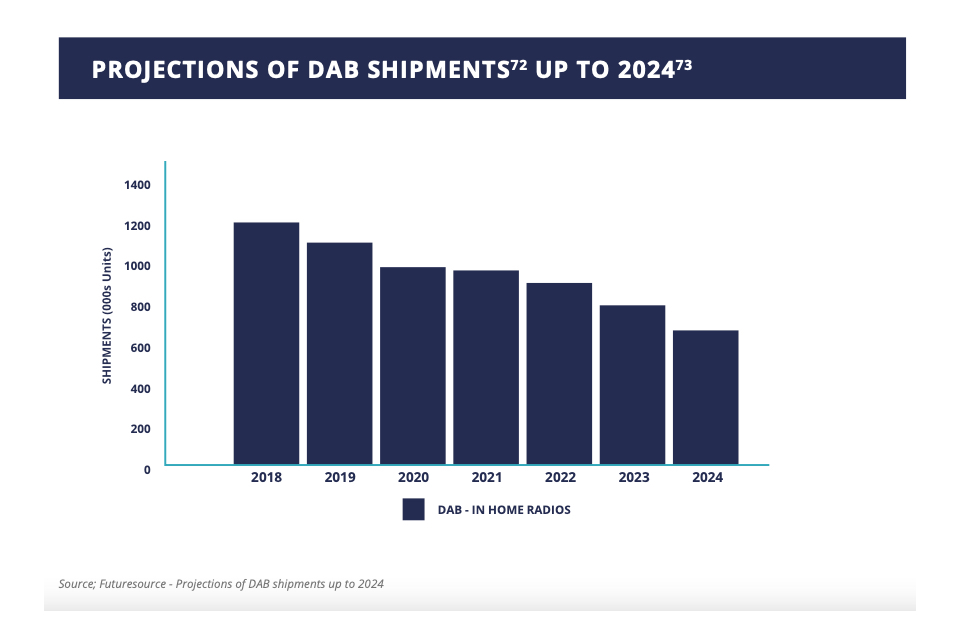 0.14 Looking at the longer term, the projected decline in analogue radio listening (which Mediatique estimates will account for just 12%-14%[footnote 8] of all radio listening by 2030 according to their forecasts conducted for the Review) means that the UK radio industry should begin preparing the ground for a possible switch-off of analogue services at some point after 2030. A failure to prepare carefully for this scenario, or to take the necessary steps as an industry when radio is in a relatively strong position, would be to gamble with the future of the UK’s oldest and arguably most successful broadcast medium.