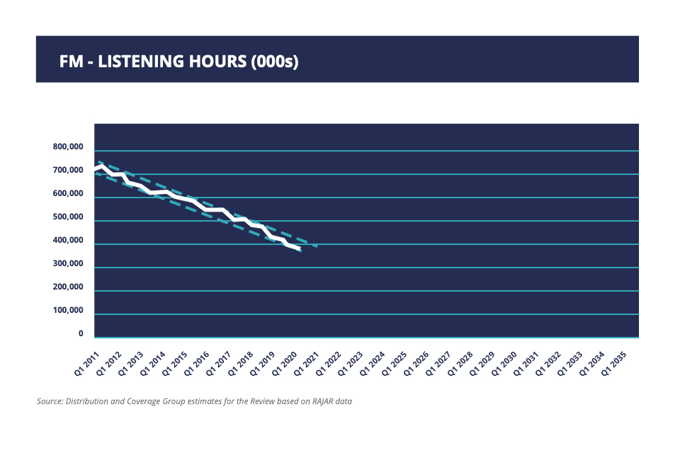 0.13 Radio’s audience must, it goes without saying, be central to the transition to a wholly digital and hybrid future. So while an eventual switch-off of AM and FM networks will help to reduce the long-term costs of dual networks, the transition needs to work for all listeners in all parts of the UK. AM - which according to estimates calculated for the Review now accounts for just 3% of all radio listening - has reached the point where the BBC, commercial radio and Ofcom need to prepare for the retirement of national services. However, traditional radio, including FM services, is valued by many listeners - particularly those who are older or vulnerable, drive older cars or live in areas with limited DAB or broadband coverage. On current trends, therefore, the Review’s conclusion is that FM will be needed until at least 2030.