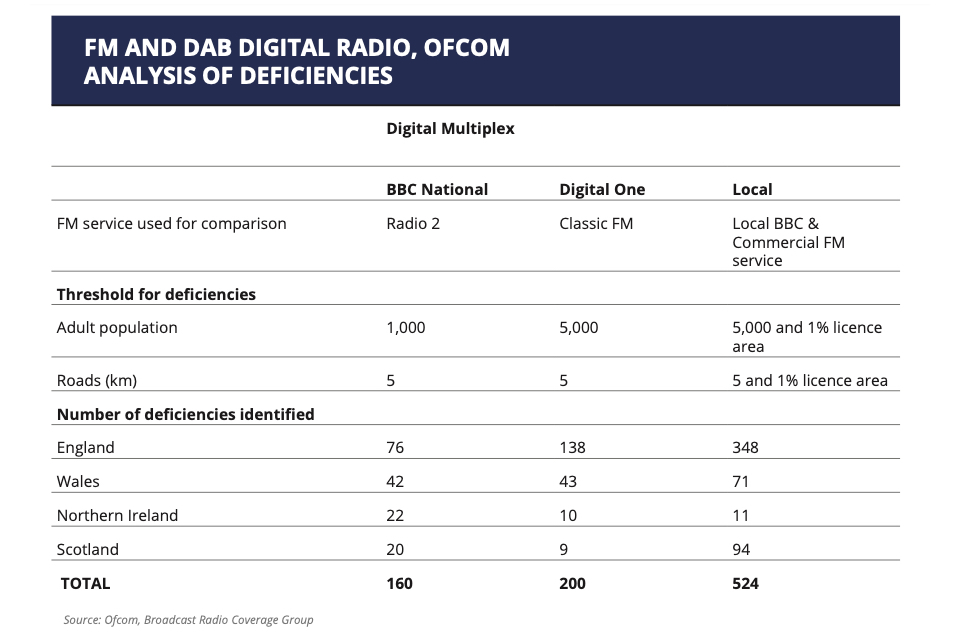 Comparisons between coverage figures for different platforms need to be treated with caution. Different technologies use different computer models and make various assumptions about a range of parameters (e.g. the signal strength required for good audio reception, interference and the extent to which the signal may be reduced by buildings in urban areas). Ofcom caution that using sets of data produced by the regulator for different technologies as if they are directly comparable is likely to lead to unreliable conclusions. ↩