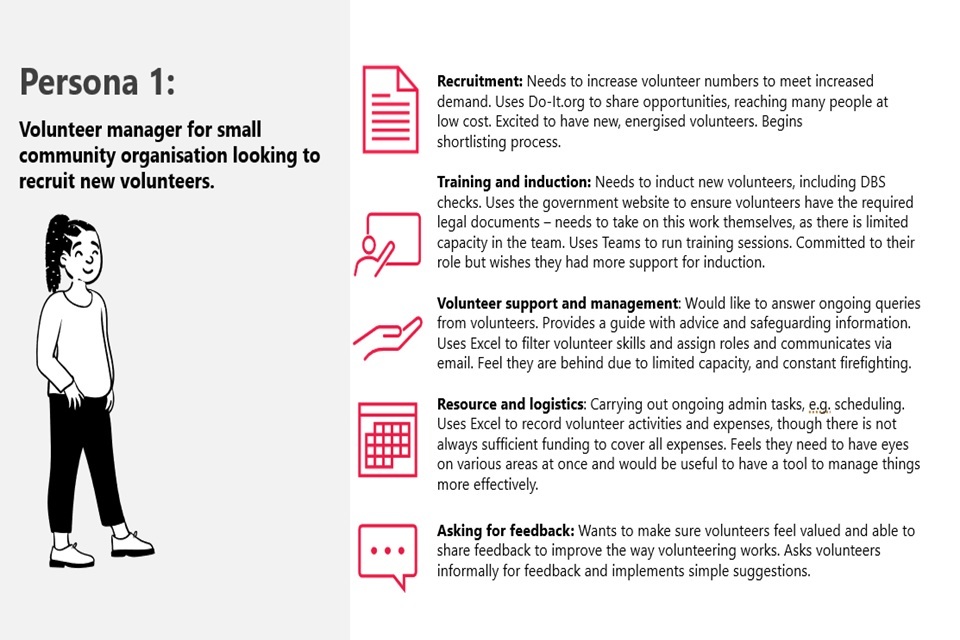 User journey– A specific visualisation which shows the sequence of events a user might encounter while using a specific product or service. It typically maps these journeys through multiple lenses to understand users’ motivations, needs, feelings and behaviours at different stages of this journey. It also involves creating ‘user personas’, which seek to realistically represent the experiences of individuals or communities, and generally include information such as demographic features, behaviours, and aspirations (Thomasoo, R. and Shea, J., 2017). A typical ‘volunteer journey’ was created for the purposes of this research drawing on the Phase 1 scoping work. It takes the four key stages of the journey broadly as follows: recruitment, onboarding (training and induction), ongoing management and feedback.