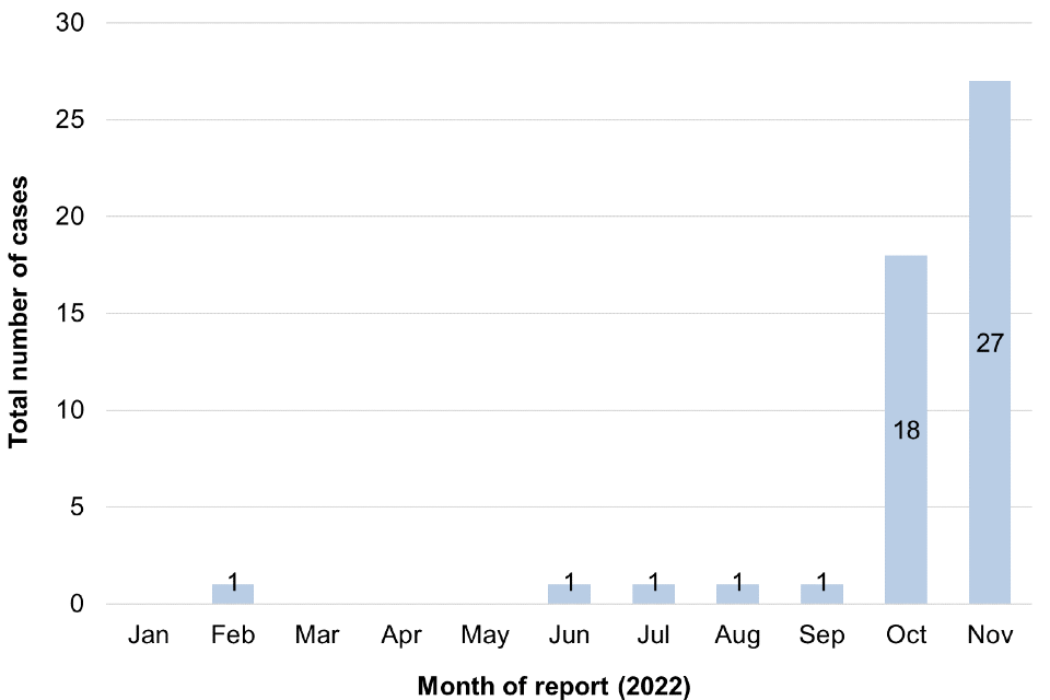 Since 1 June 2022, there has been an increase in cases of diphtheria due to toxigenic C. diphtheriae reported among asylum seekers in Europe (3). A similar increase in cases has been reported in the UK with the first confirmed case identified in February in the South East region and a further 49 confirmed cases reported as of 25 November 2022. These include 18 cases in October and 27 cases in November (see Figure 1). Cases have mostly been identified in the South East region of England shortly after arrival to the UK (see Figure 2).