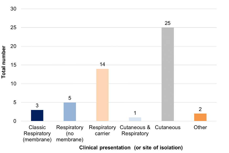 There has been one case with both respiratory and cutaneous presentation and 2 cases with other presentations (toxigenic C. diphtheriae was isolated from a urethral swab and a penile skin swab, but with no lesions or significant wounds noted).