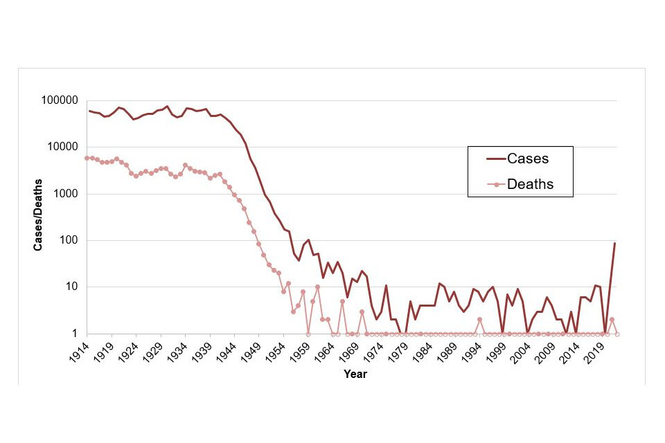 Figure 2. Diphtheria cases and deaths, England and Wales, 1914 to 2022