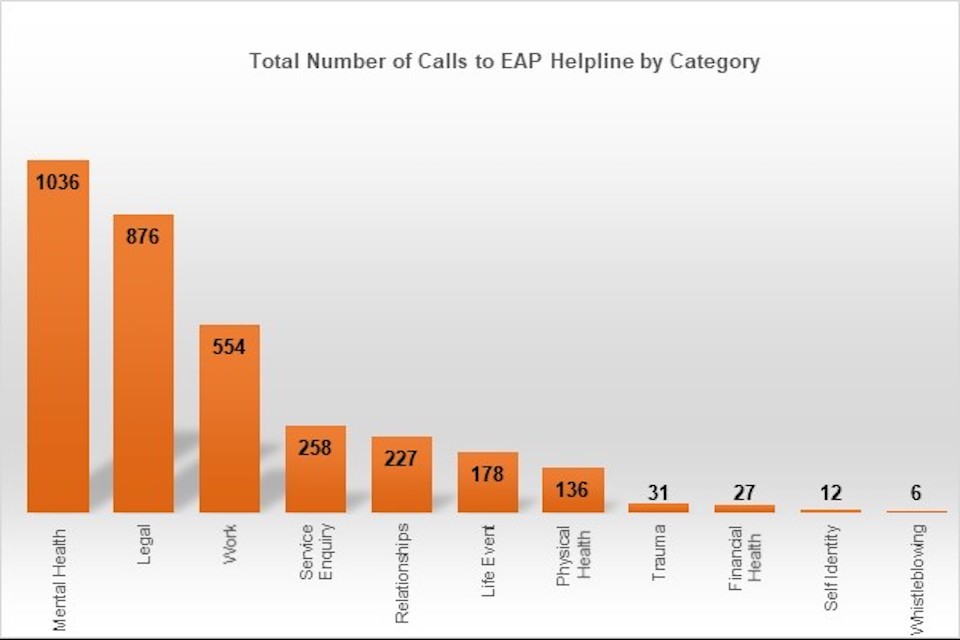 At the end of October 2020, there had been a total of 3341 calls to the EAP helpline. 1036 or 31% were related to mental health. 876 calls or 26% were about legal matters and 554 calls or 17% were about work. 258 or 8% of calls were about service enquiries and 227 or 7% were about relationships. The remaining 10% of calls were about life events (176), physical health (136), Trauma (31), Financial Security (27), Self-Identify (12) or Whistleblowing (6).