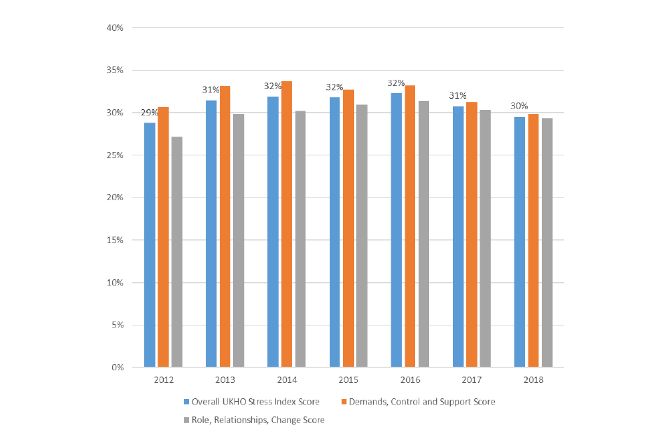 We also utilise the Civil Service People Survey Proxy Stress Index results, which measure how stressful the workplace is; the higher the index score, the more stressful the workplace is perceived to be. The questions, which make up the index are aligned to the Health and Safety Executive Stress Management Standards. Factors include higher workloads, lower control over how work is done, and poorer support from team and manager.