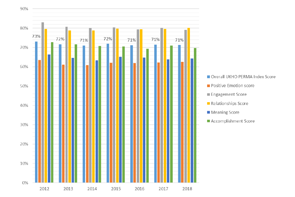 As can be seen below, in 2018 UKHO had a PERMA Index score of 71%, which has been stable since 2016; however, the score has reduced, overall, since 2012 (by 2%) We’re working hard to improve this score, which is less than the Civil Service median (73%).