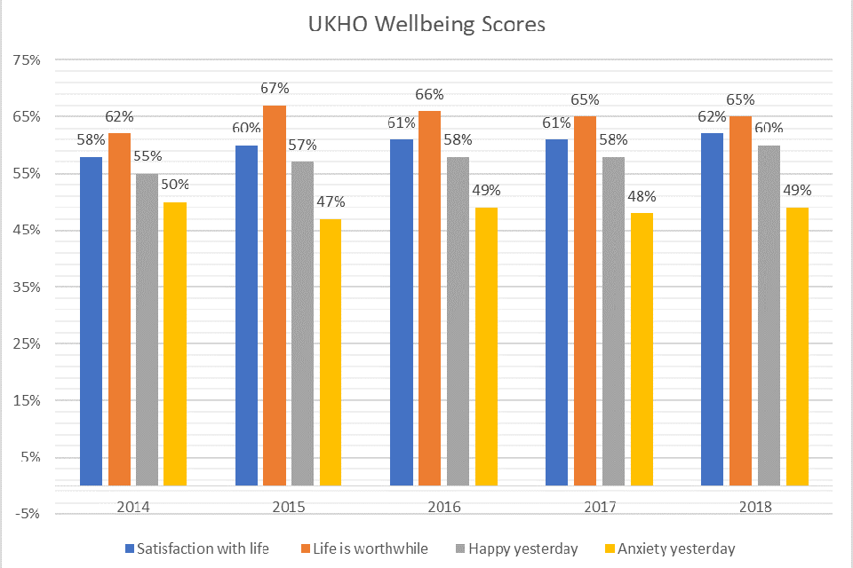Graph showing UKHO wellbeing scores from 2014-2019 - showing higher life satisfaction, happiness and sense that life activities are worthwhile and higher anxiety levels for 2019