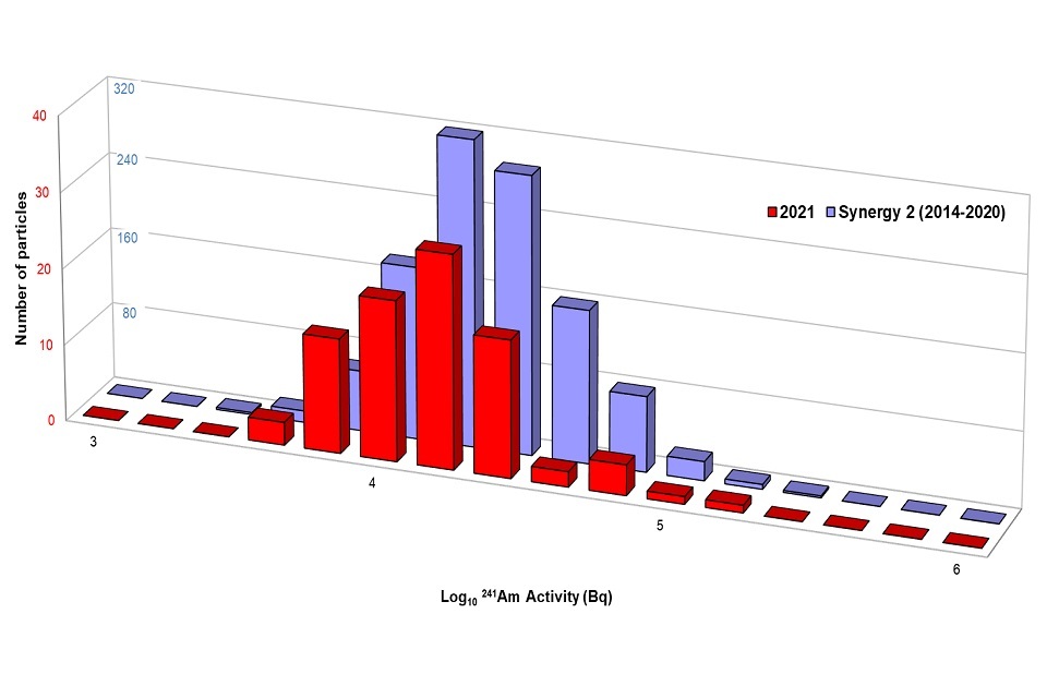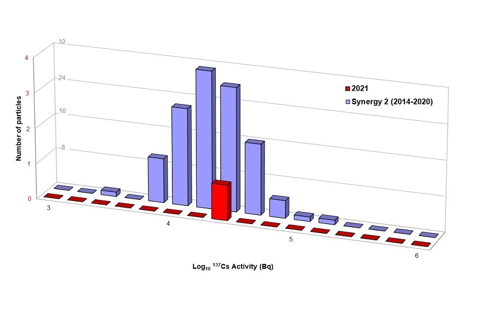 The distributions of caesium-137 and americium-241 activities for particles and larger objects recovered by the beach monitoring programme in 2021 were similar to those measured in 2020 and within the ranges previously observed.