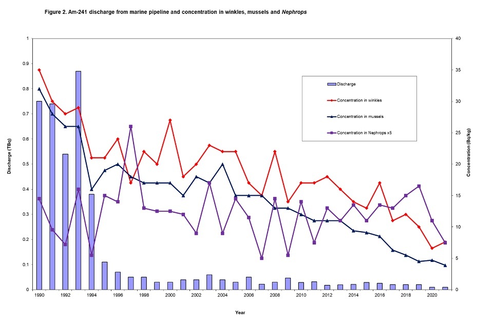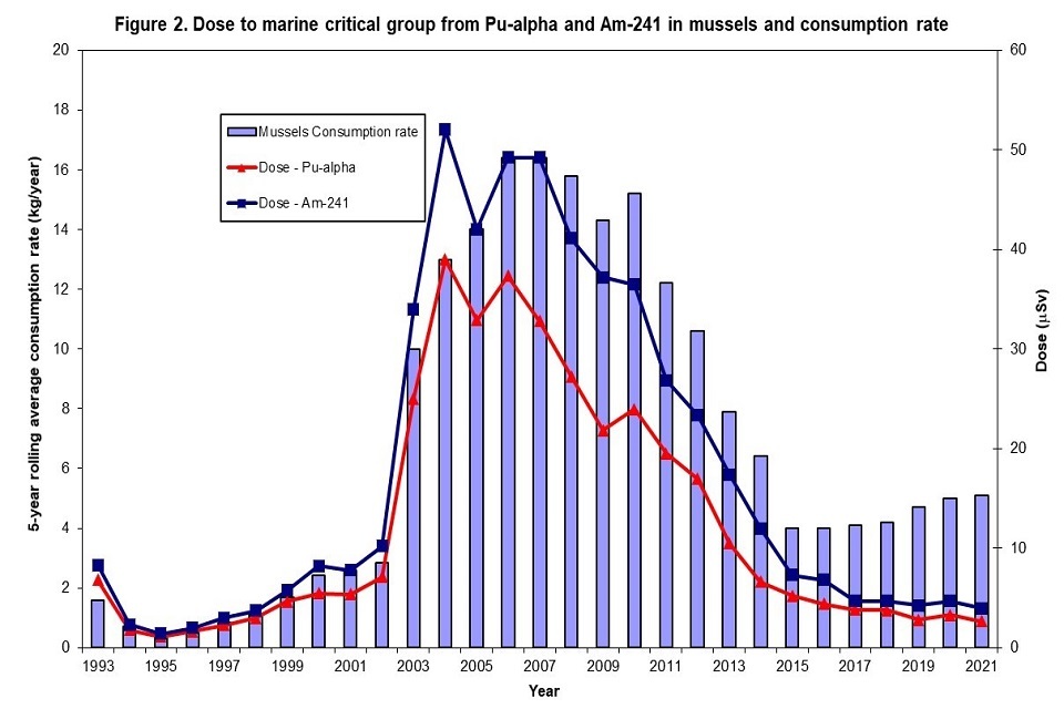 The most significant radionuclides contributing to this dose are plutonium-alpha and americium-241, with the environmental concentrations of these radionuclides being mostly due to historic discharges.