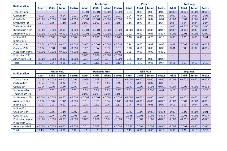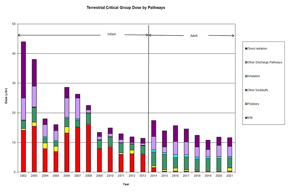 The total dose to the terrestrial critical group (adults) was estimated as 12 µSv which is unchanged from the dose reported for 2020. The most significant radionuclide contributing to adult dose received from the consumption of terrestrial foodstuffs is iodine-129 in potatoes (0.4 µSv).