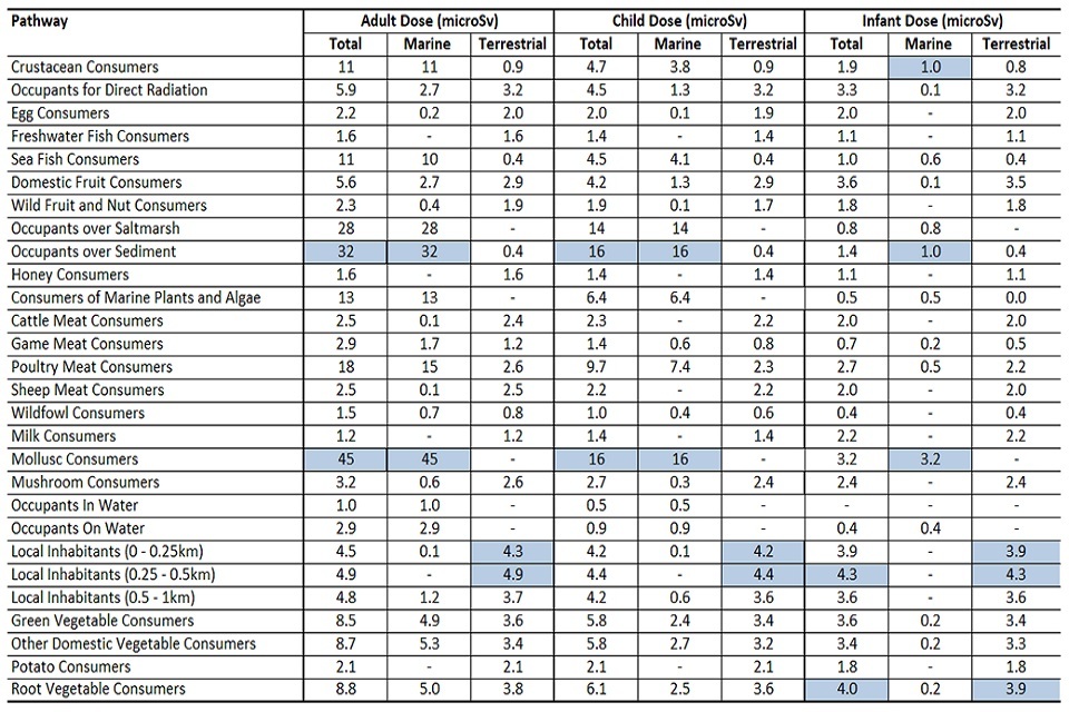 The estimated doses for the marine and terrestrial critical groups are much lower than the dose constraint for exposure of members of the UK public to man-made controlled sources of radiation (1000 µSv).