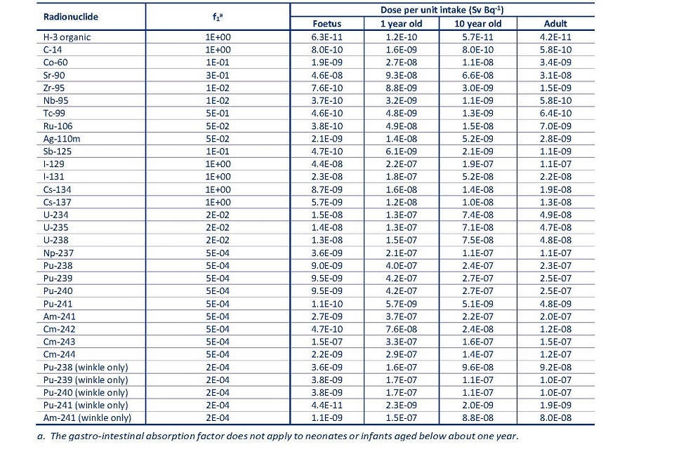 - Committed effective dose - The time integral of the effective dose from ingested and inhaled radioactivity delivered over 50 years (adults, who are cautiously assumed to be 20 years old at the time of intake) or to age 70 years (children). For a particular radionuclide, it is a function of the distribution within and clearance from the body and also the radioactive half-life. For radionuclides which are cleared quickly from the body (e.g. caesium-137) or which have a short half-life (e.g. sulphur-35), most of the committed effective dose is delivered in the year in which the intake of activity took place. For others, such as plutonium, the committed dose is delivered over the remaining lifetime of the individual and so the dose in the year of intake is much lower than the committed dose.