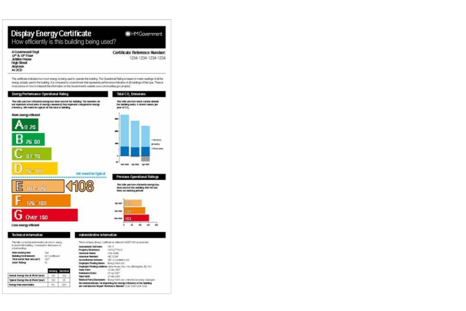 The DEC will also show the unique certificate reference number under which the DEC has been registered, the address of the building, the total useful floor area of the building, the name and address of the energy assessor, the name of their accreditation scheme and the date when the DEC was issued.