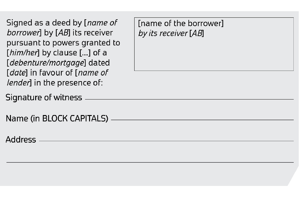 Below is a suggested form of execution by an Law of Property Act receiver in the name and on behalf of a borrower under the authority of provisions contained in the mortgage or debenture (that is, not pursuant to a specific power of attorney).