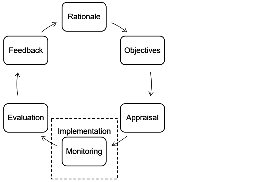 Shows the policy making cycle of ‘ROAMEF’ Rationale, Objectives, Appraisal, Monitoring, Evaluation and Feedback.
