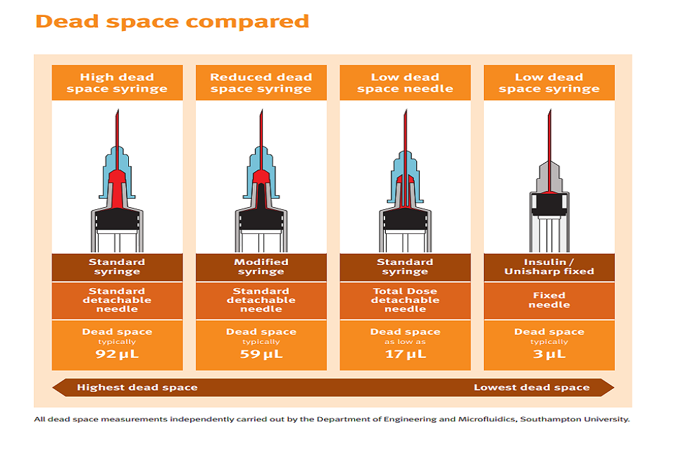 The graphic shows different types of syringes with different amount of dead space, from highest to lowest dead space