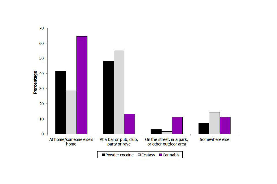 Adults who had last taken cannabis were more likely (65%) to have obtained the drug at home or at someone else’s home compared with adults who had last taken powder cocaine (42%) and adults who had last taken ecstasy (29%).