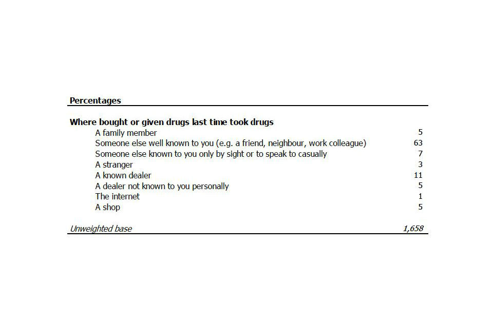 Around one in 6 (16%) adults obtained the drugs (whether bought or given) from a dealer (11% from a known dealer and 5% from a dealer not known to the respondent personally).