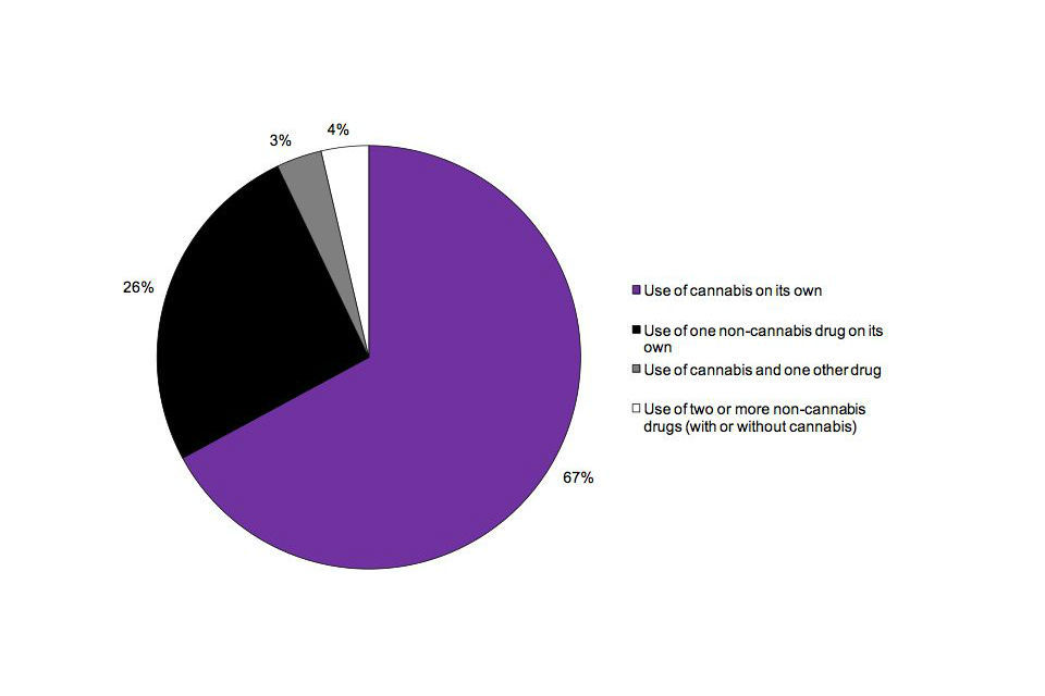 In addition to this, 67 % of the most recent incidents of drug use in the last year consisted of the use of cannabis alone and 26 % the use of a single non-cannabis drug.