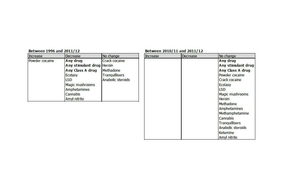 - an increase in last year powder cocaine use from 1996 (0.6%) to 2008/09 (3.0%) since when it has declined to 2.2% (2011/12).