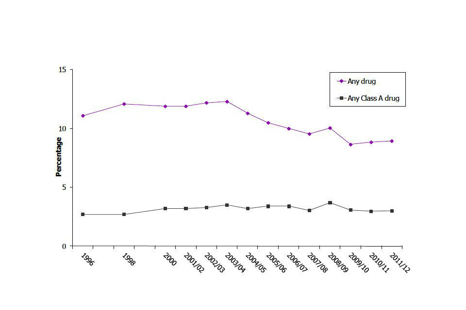 Last year Class A drug use among 16 to 24 year olds has fallen in the long term from 9.2% in 1996 to 6.3% in 2011/12 (similar to the 6.6% in 2010/11). The gradual decline is partly a result of falls in last year usage of ecstasy (from 6.6% to 3.3%) and hallucinogens (from 5.3% to 1.4%) which have been partially offset by an increase in powder cocaine use (from 1.3% to 4.2%).