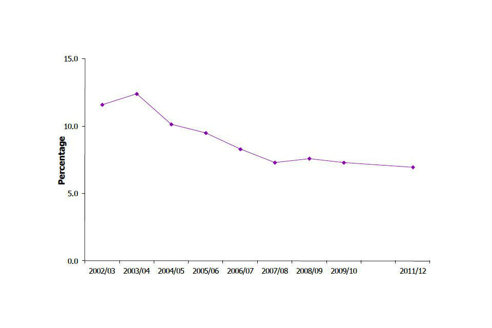 Between the 1996 and 2011/12 surveys, last year use of any illicit drug fell (from 11.1% to 8.9%), due in large part to a notable decline in cannabis use (from 9.5% to 6.9%). Any last year drug use remains around the lowest level since measurement began; the last fall was seen between 2008/09 (10.1%) and 2009/10 (8.6%).