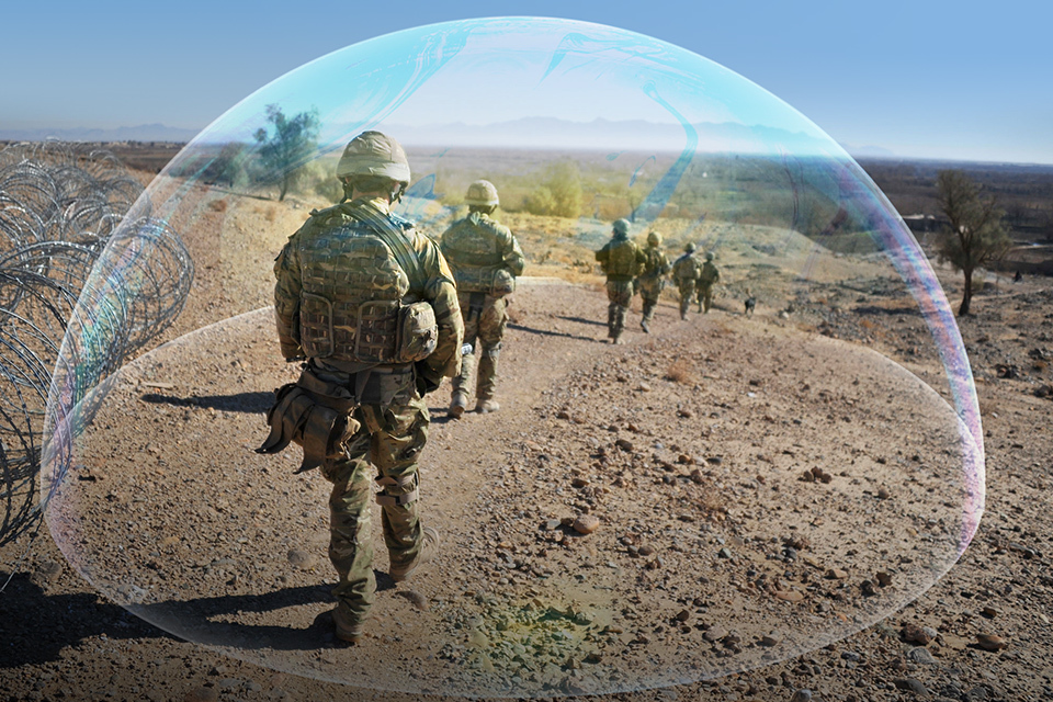 Soldiers walking outdoors surrounded by a graphic of a protective bubble