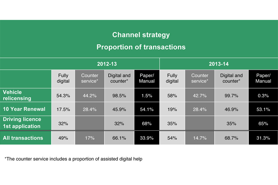 Since 2002, the DVLA change programme has consistently introduced services that have reduced the volume of paper transactions by 58% through online or digitally assisted services (via the web, the post office or other commercial enterprises).This digital direction is the core of the DVLA operational change programme. We will consistently aim to provide the most efficient, effective services to meet the needs of a diverse but ever growing digitally aware customer base, whilst recognising the needs of the important minority through assisted digital services.