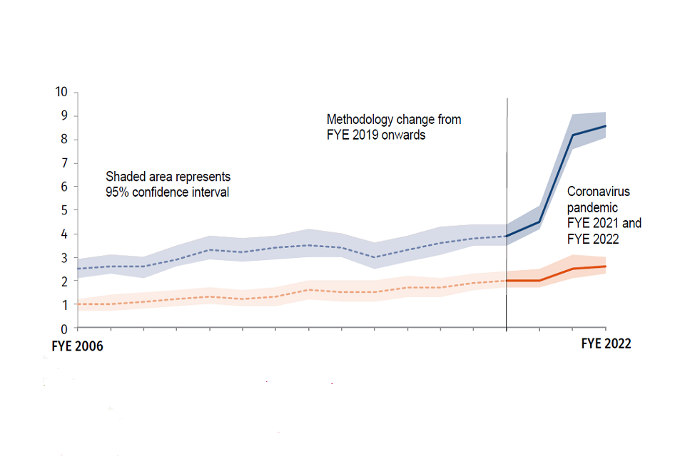 We can recover overpayments from people, which means that not all of the £8.6 billion is lost. In 2021-22, we recovered £1.0 billion of overpayments (£0.4 billion Housing Benefit and £0.6 billion other DWP benefits.) The net fraud and error loss – after benefit debt recovery is factored in – was 3.5% or £7.6 billion. This reduced the overall loss to the Exchequer. Note that most recoveries made by DWP are not included in our net loss estimate as they do not relate to overpayments recorded in our fraud and error reporting, for example recovery of Tax Credits and benefit advances. ↩