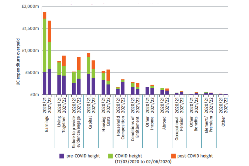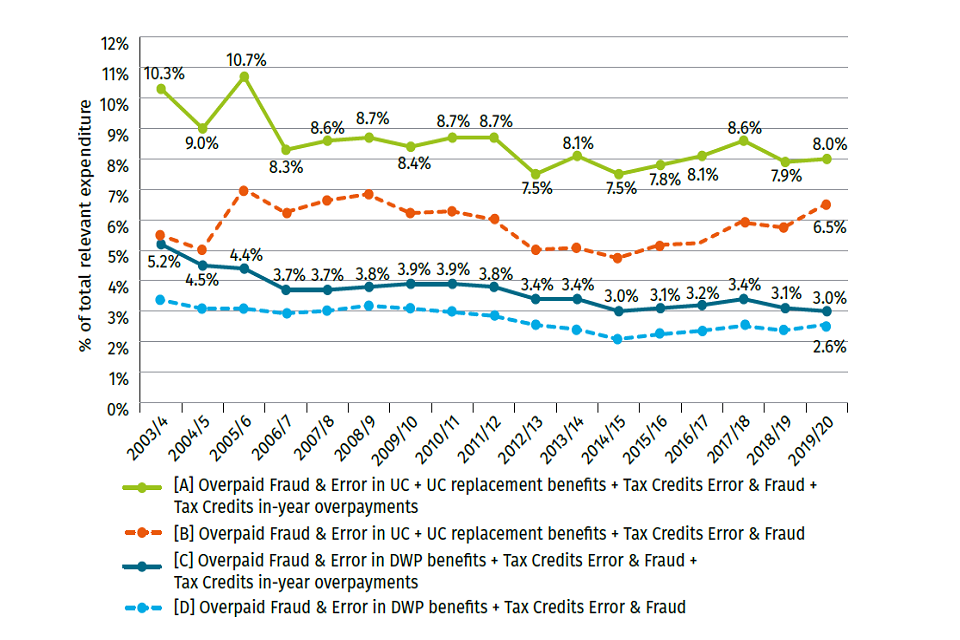 We define fraud as where claimants deliberately claim money they aren’t entitled to. We split error into two categories: claimant error, which occurs when claimants provide inaccurate information, and official error, which occurs when we process information incorrectly or fail to apply rules. ↩