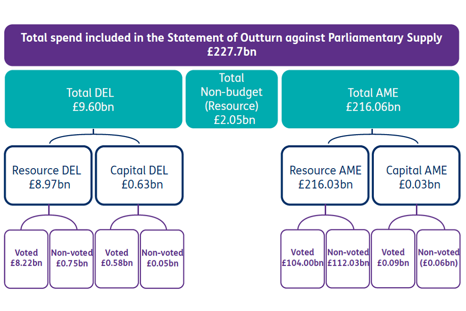 Benefit expenditure stated within this note is based on the latest available forecast expenditure for 2021-22, at the time the estimate was prepared. For this reason, it does not agree to that seen in the Statement of Comprehensive Net Expenditure (SoCNE) of £224.5 billion, or the Statement of Outturn Against Parliamentary Supply (SOPS) of £216.0 billion. The difference between these values is due to disaggregation in the SOPS between DEL and AME, resource and capital expenditure. ↩