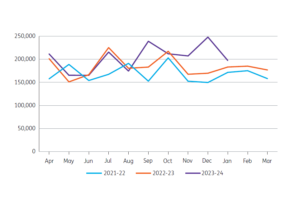Cases received for IPRs can cover more than one DWP service line as customers may have more than one benefit in payment, meaning the customer can have more than one primary service line recorded for the IPR. The chart below shows the primary service lines relating to the customers’ cases accepted to IPRs across 2023-24.
