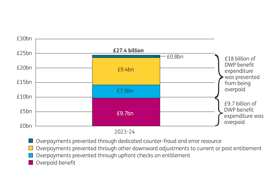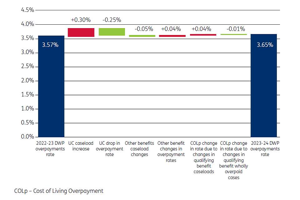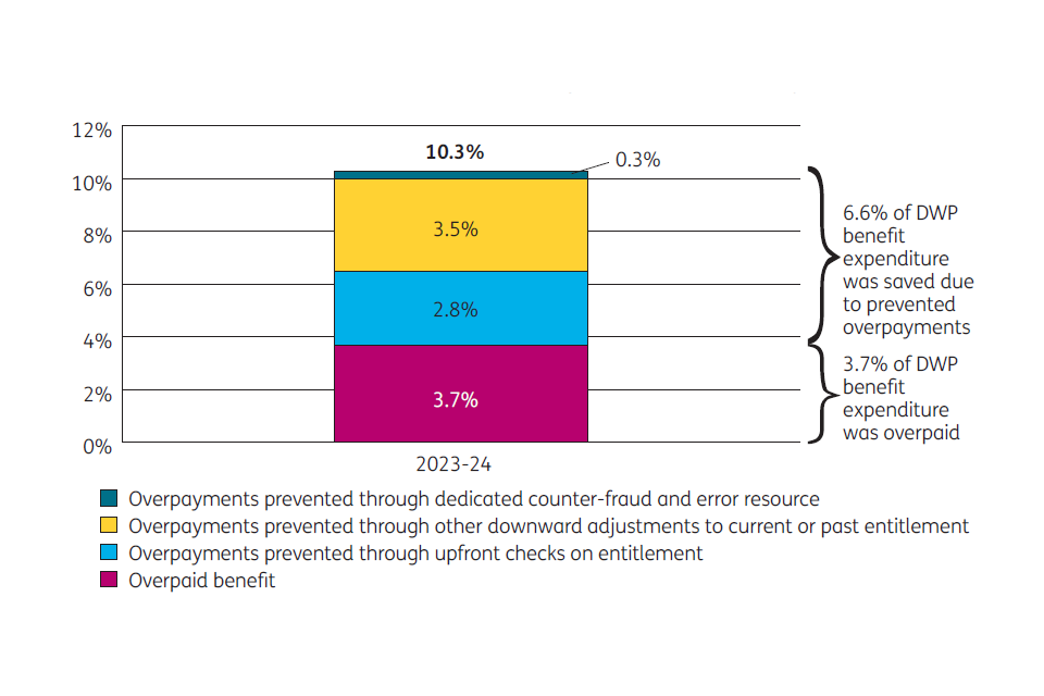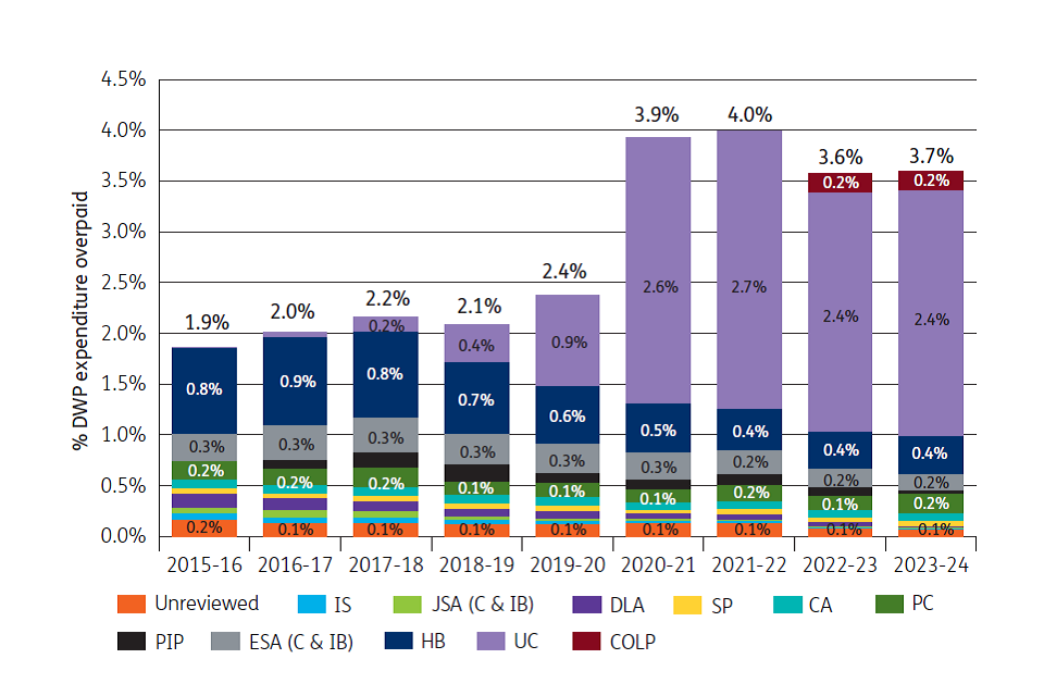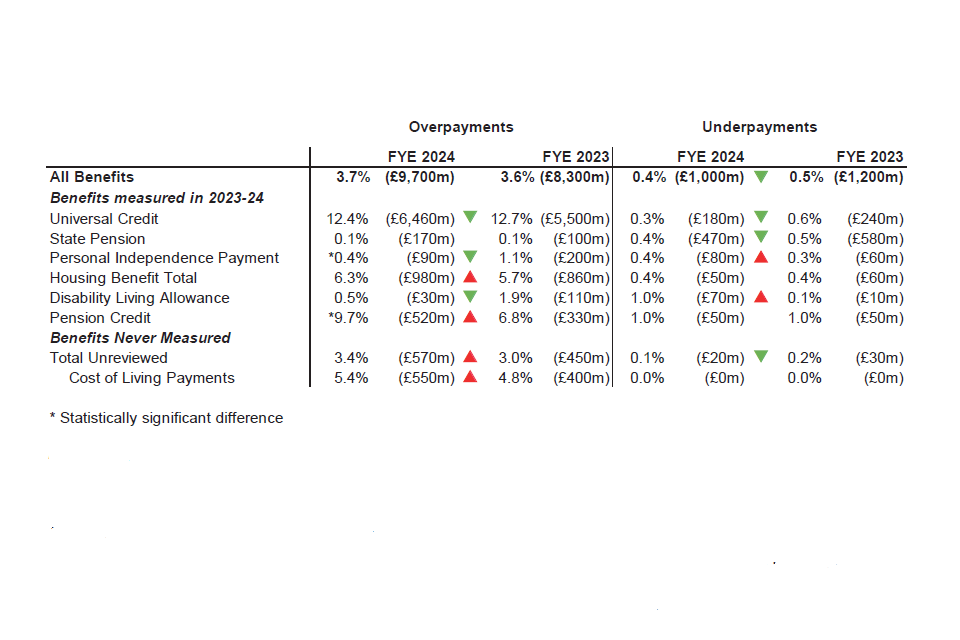 An overpayment happens when people are paid too much benefit, which happens in instances where fraud is being committed, where DWP has made an error or the customer has made an error. An underpayment happens when people are not paid enough benefit, which happens in instances where DWP has made an error, classified as official error. ↩
