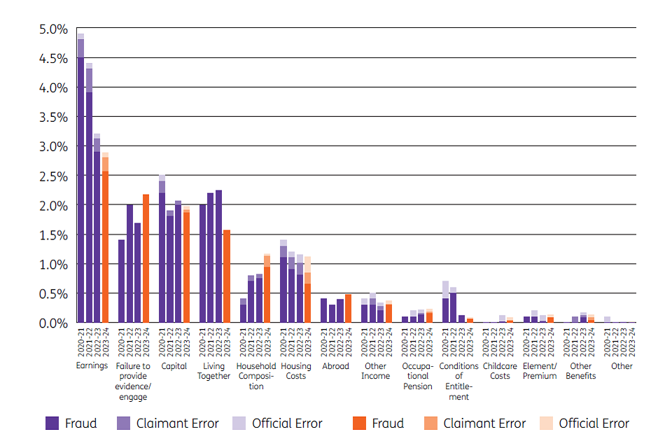 DWP defines fraud as where claimants deliberately claim money they aren’t entitled to. The Department splits error into two categories: claimant error, which occurs when claimants provide inaccurate information, and official error, which occurs when the Department processes information incorrectly or fail to apply rules. ↩