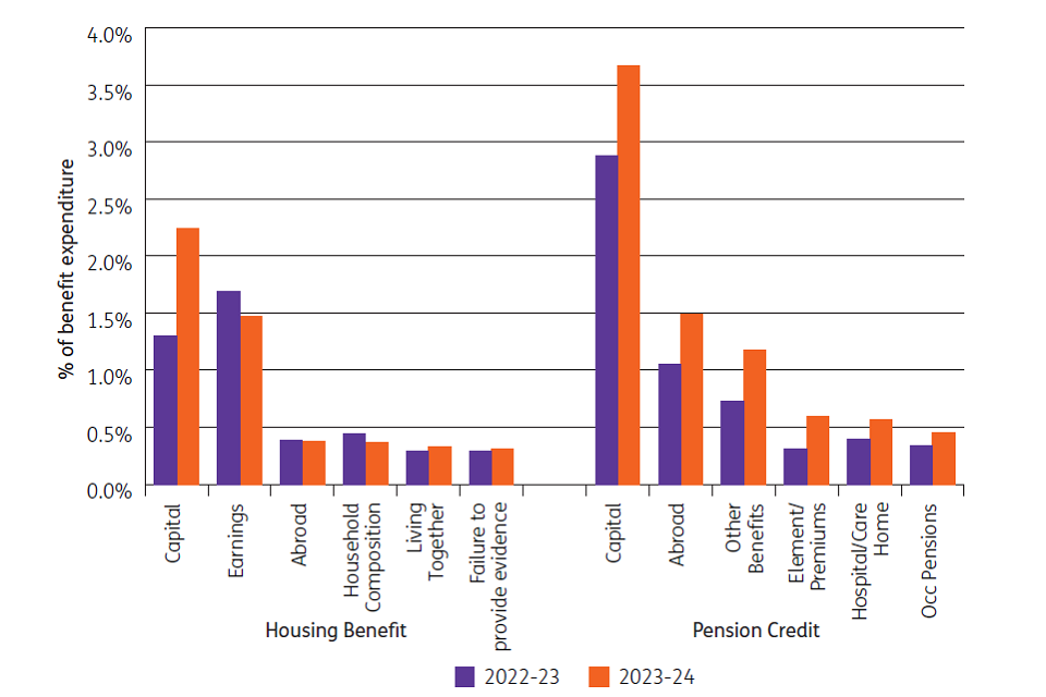 Money recovered this year comprises in-year 2023 to 2024 figures for directly administered benefits plus figures for Housing Benefit for the period October 2022 to September 2023. Further information can be found at www.gov.uk by searching for Fraud and Error in the Benefit System 2023 to 2024. ↩
