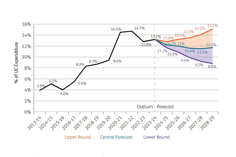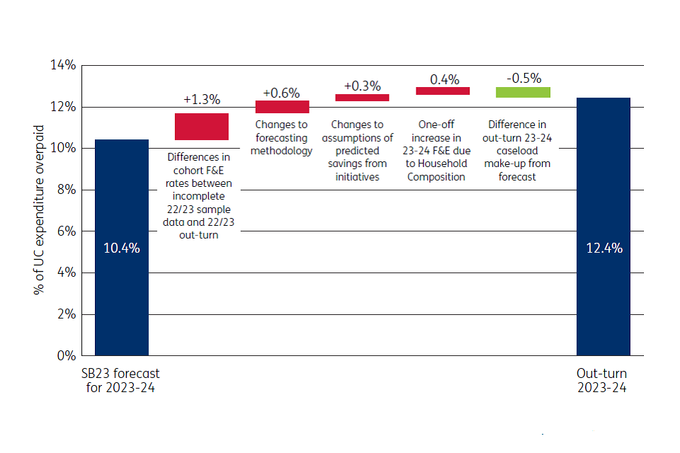 Note that the 2023 Spring Budget forecast for the overpayment rate in Universal Credit, as published in the NAO’s Report on Accounts last year, was significantly lower. The rise in the forecast level of overpayments in the 2024 Spring Budget is partly due to improvements in DWP’s forecasting model; and partly due to the final out-turn for the 2022 to 2023 financial year being higher than had been anticipated from early results observed three-quarters through the sampling exercise which informs the annual published National Fraud and Error Statistics. ↩