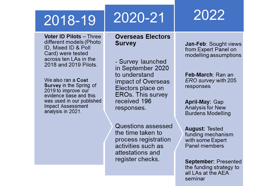 4. Engagement with the sector has been crucial over the last several years in shaping and developing the analysis on the Elections Act, particularly on Voter Identification where the largest costs will be. The chart below illustrates the engagement that the department (previously Cabinet Office) has had with the sector in developing the evidence base on the various policies.
