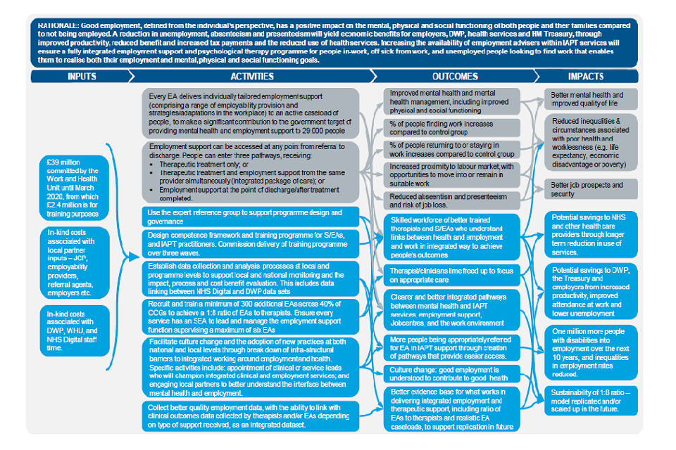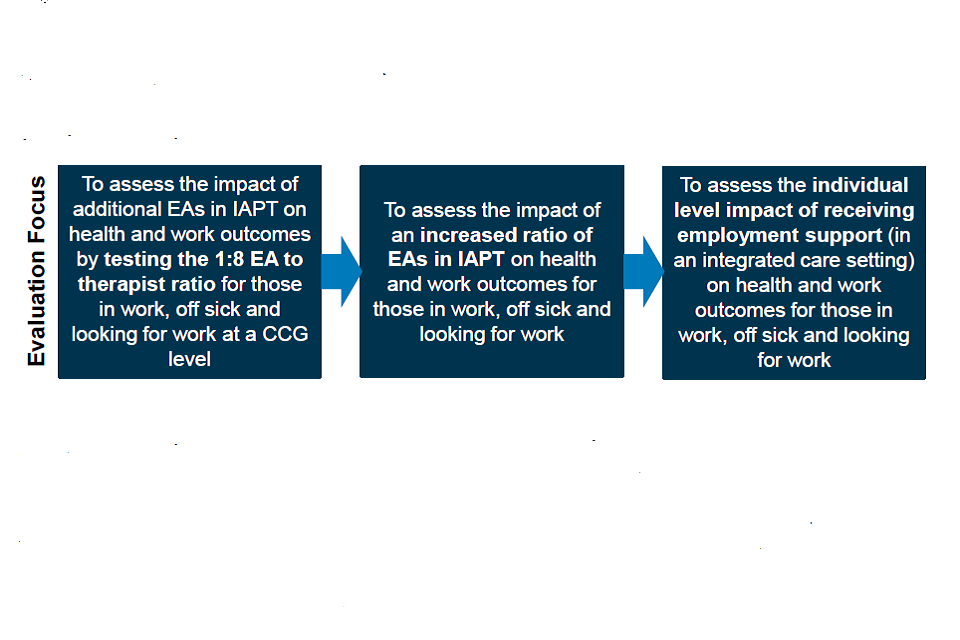 EAs in IAPT is funded by the cross-government Work and Health Unit (WHU), jointly sponsored by the Department for Work and Pensions (DWP) and Department of Health and Social Care (DHSC).