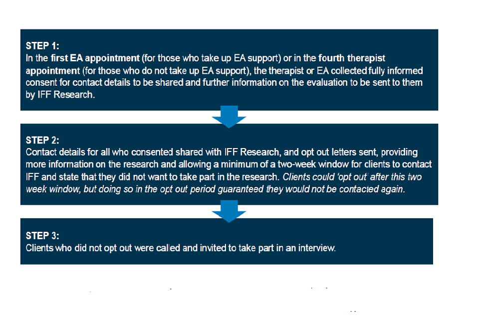 - A follow-up telephone survey with 755 Wave One clients who saw an EA, around 12 months after entering the service, and a corresponding survey with 609 Wave Two IAPT clients (including those who saw an EA and those who did not).