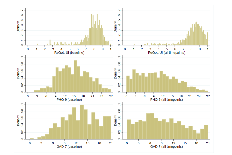 Figure 5: Distribution of ReQoL-UI, PHQ-9, and GAD-7 scores at baseline and across all time-points