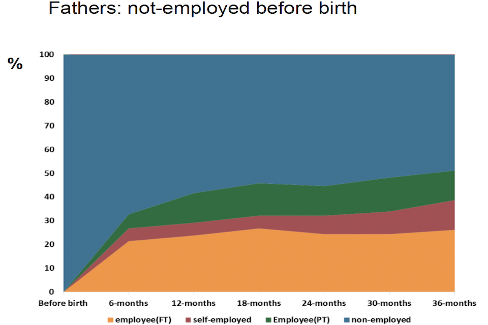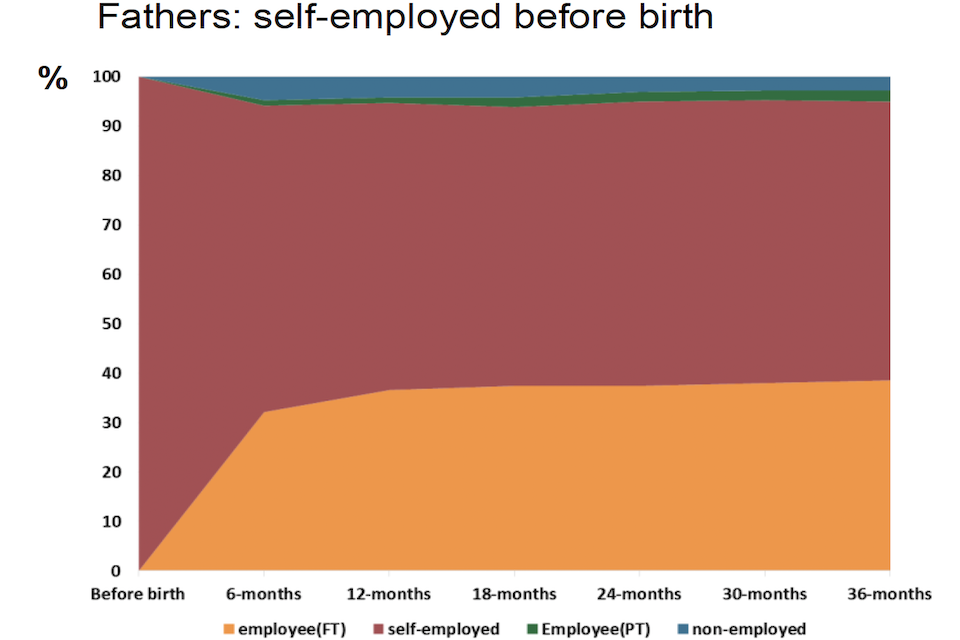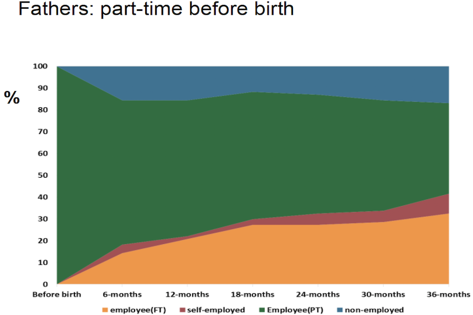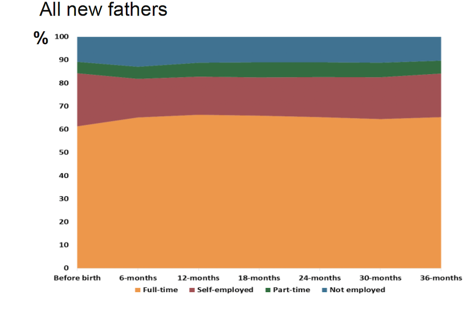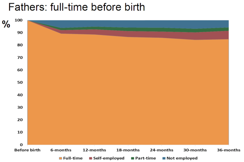 Women’s employment trajectories differ sharply from those of fathers: 3 years after childbirth 90% of men are in full-time work or self-employed, and those that do change their employment status are likely to move from being out of the labour force or part-time work into full-time jobs after birth.