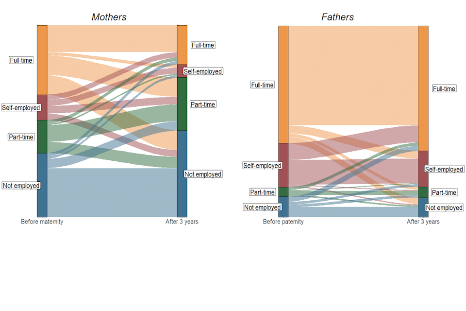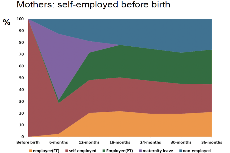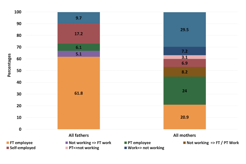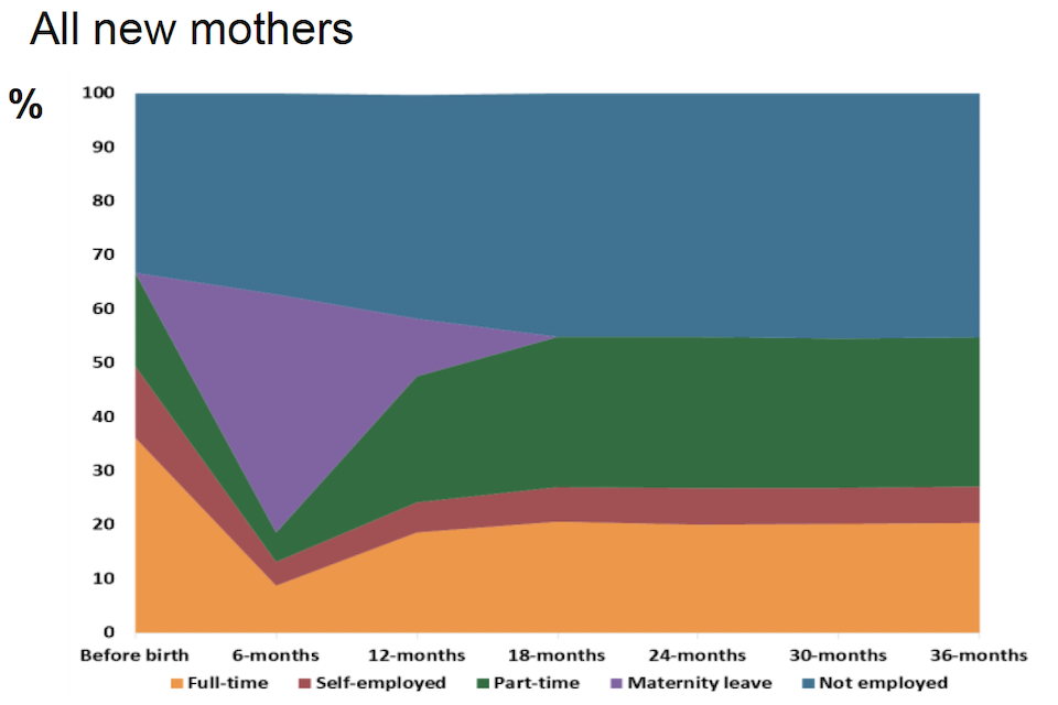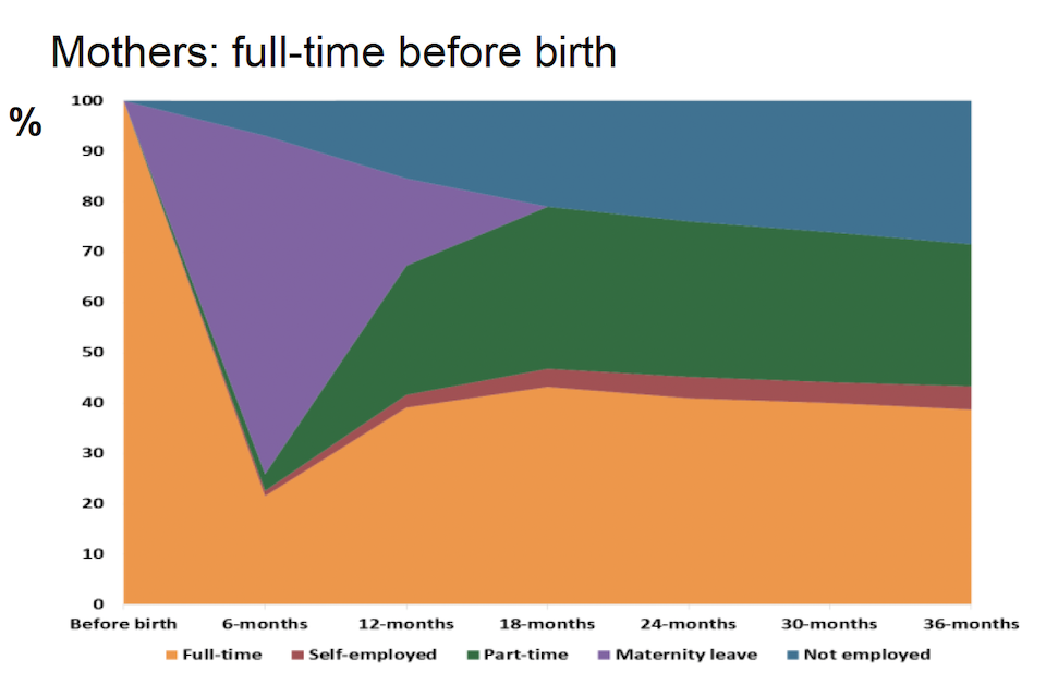 Women’s employment trajectories differ sharply from those of men: 3 years after childbirth 90% of men are in full-time work or self-employed, and those that change their employment status are likely to move into full-time jobs from being out of the labour force or working part-time work in the 3 years after birth.