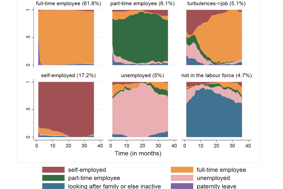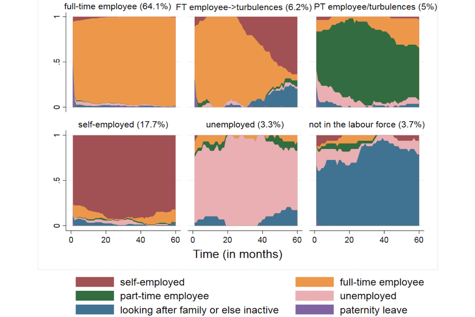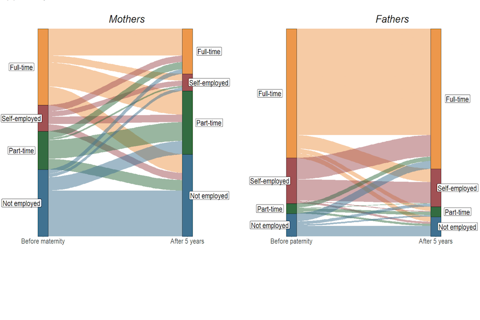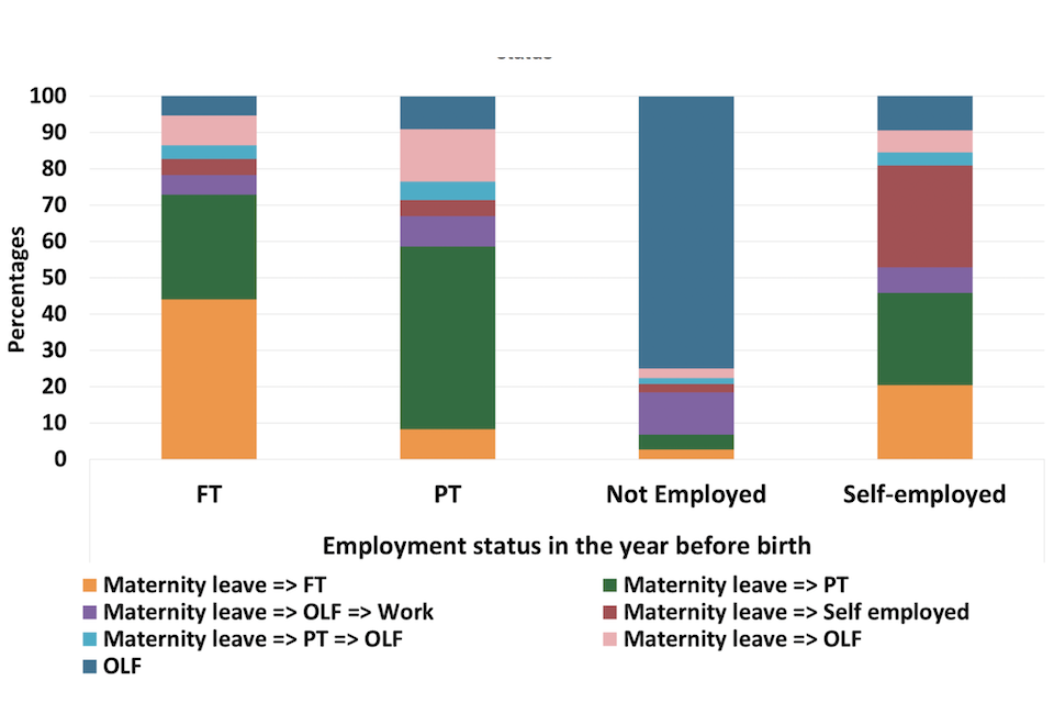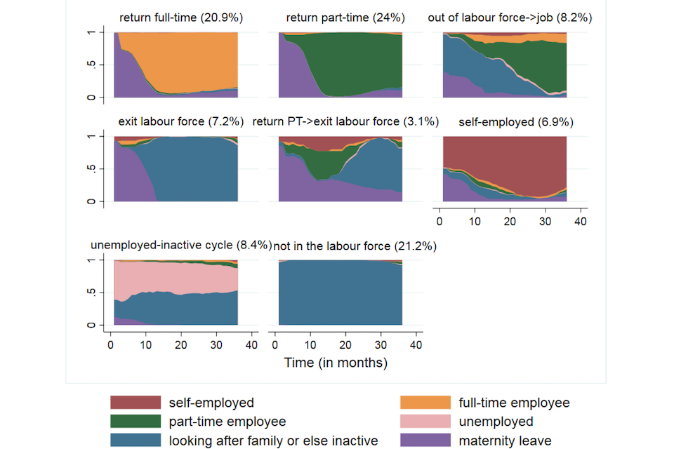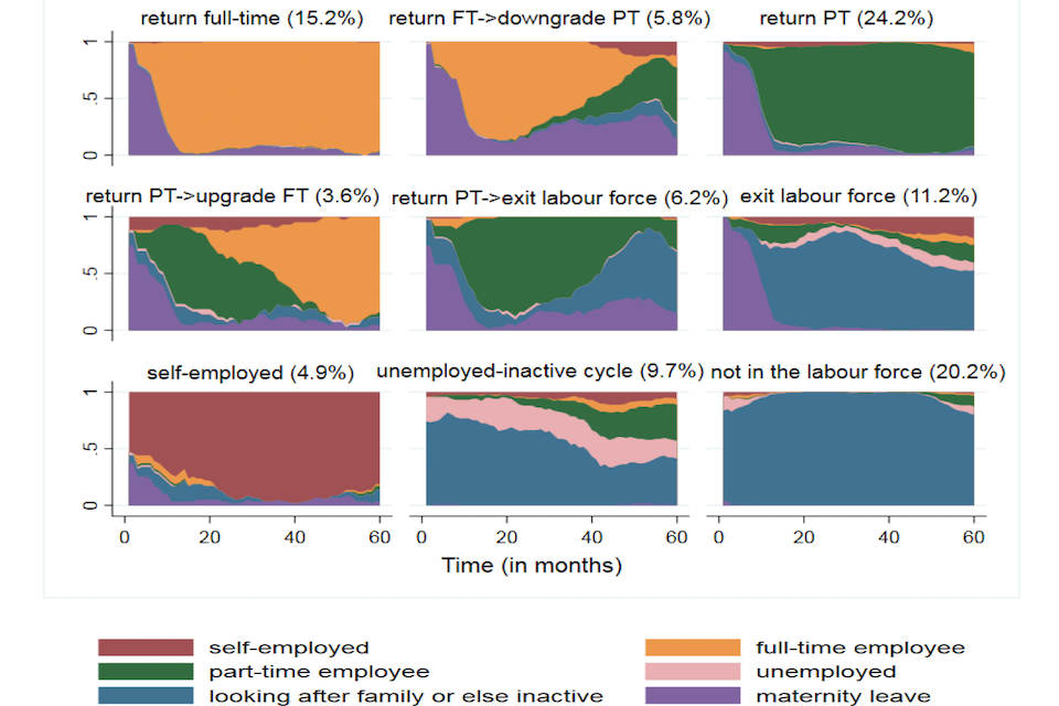 Women’s employment trajectories differ sharply from those of men: 3 years after childbirth 90% of men are in full-time work or self-employed, and those that change their employment status are likely to move into full-time jobs from being out of the labour force or working part-time work in the 3 years after birth.